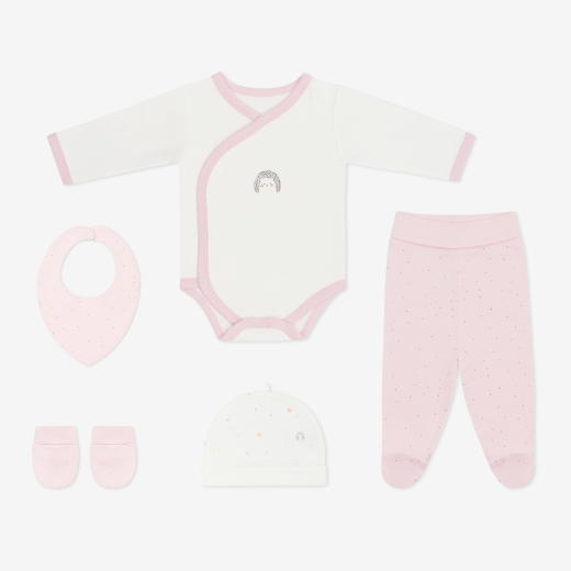 Newborn Romper Set 5 pcs HEDGE-HUGS is a lovingly curated outfit set designed to welcome your little one with comfort and style from day one. Crafted from soft premium interlock fabric, it provides a gentle touch on delicate newborn skin while offering everything needed for those precious first days.